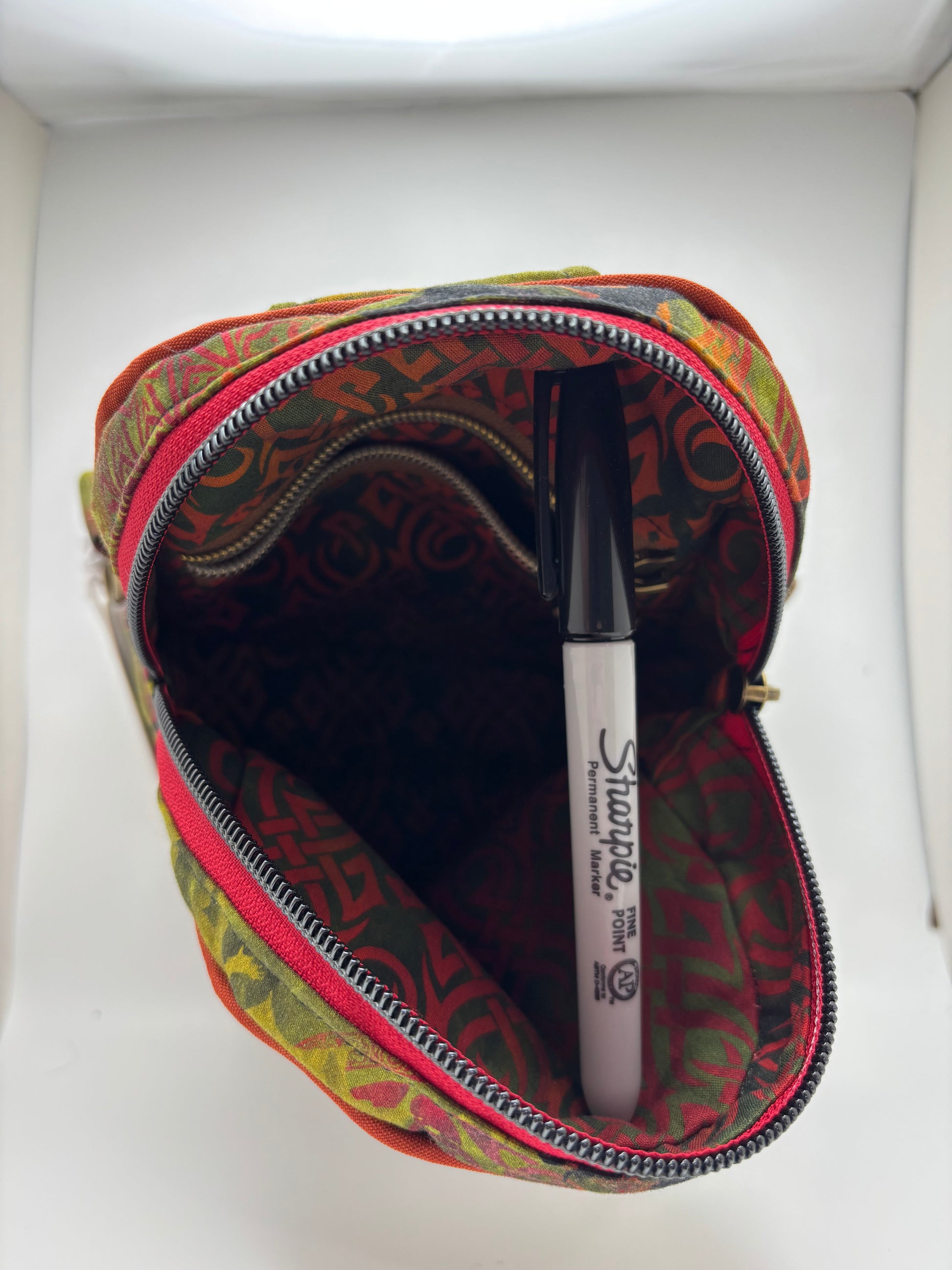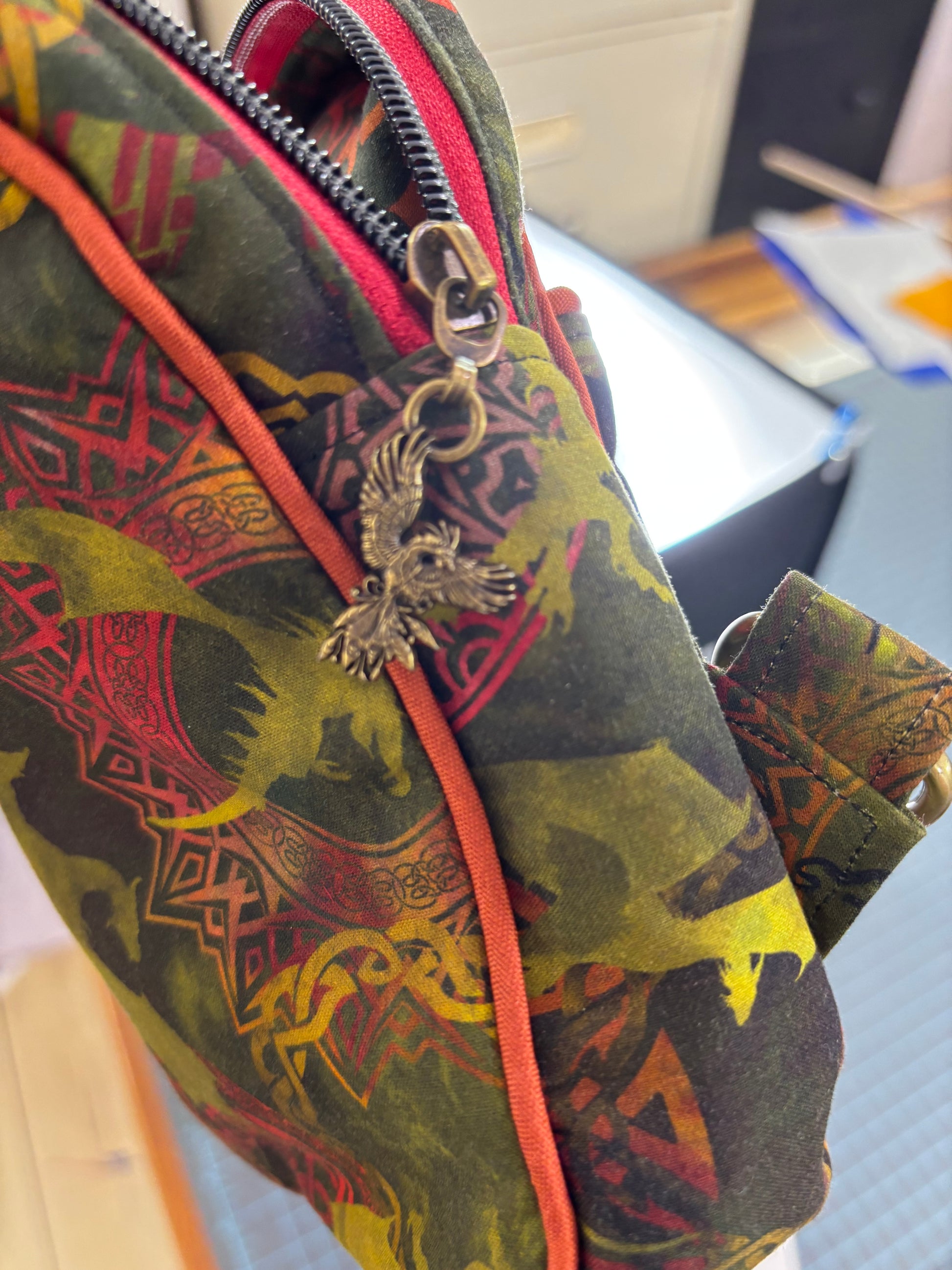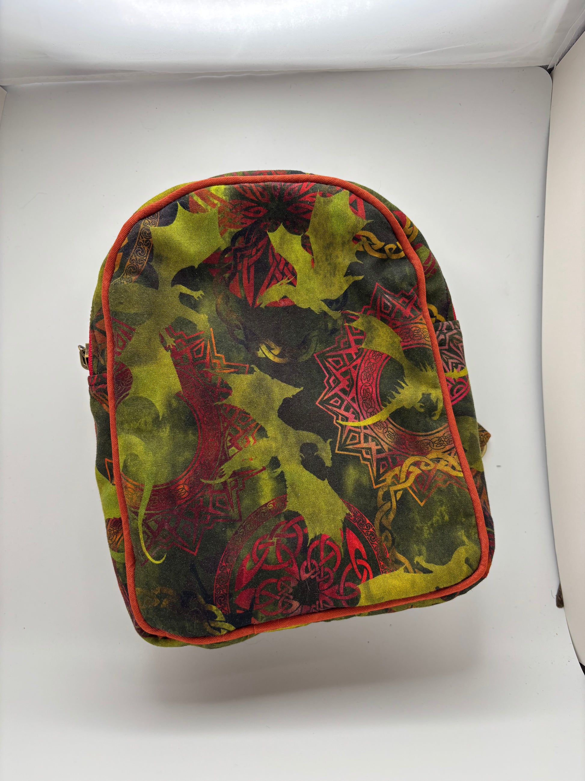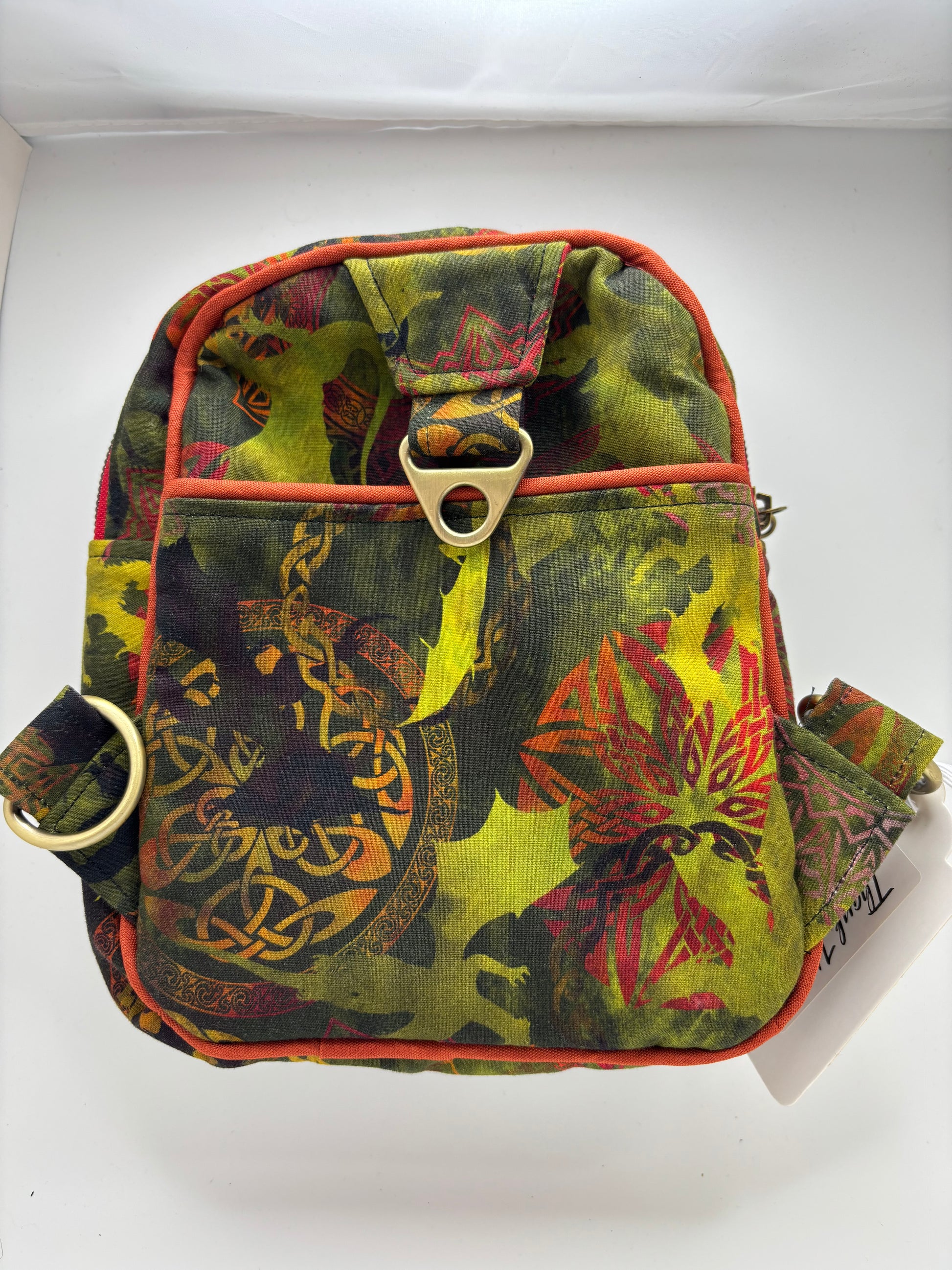 This amazing red and green Celtic dragon bag is designed as a front or back crossbody. The bag has a strap that will fit an adult and an older child.
