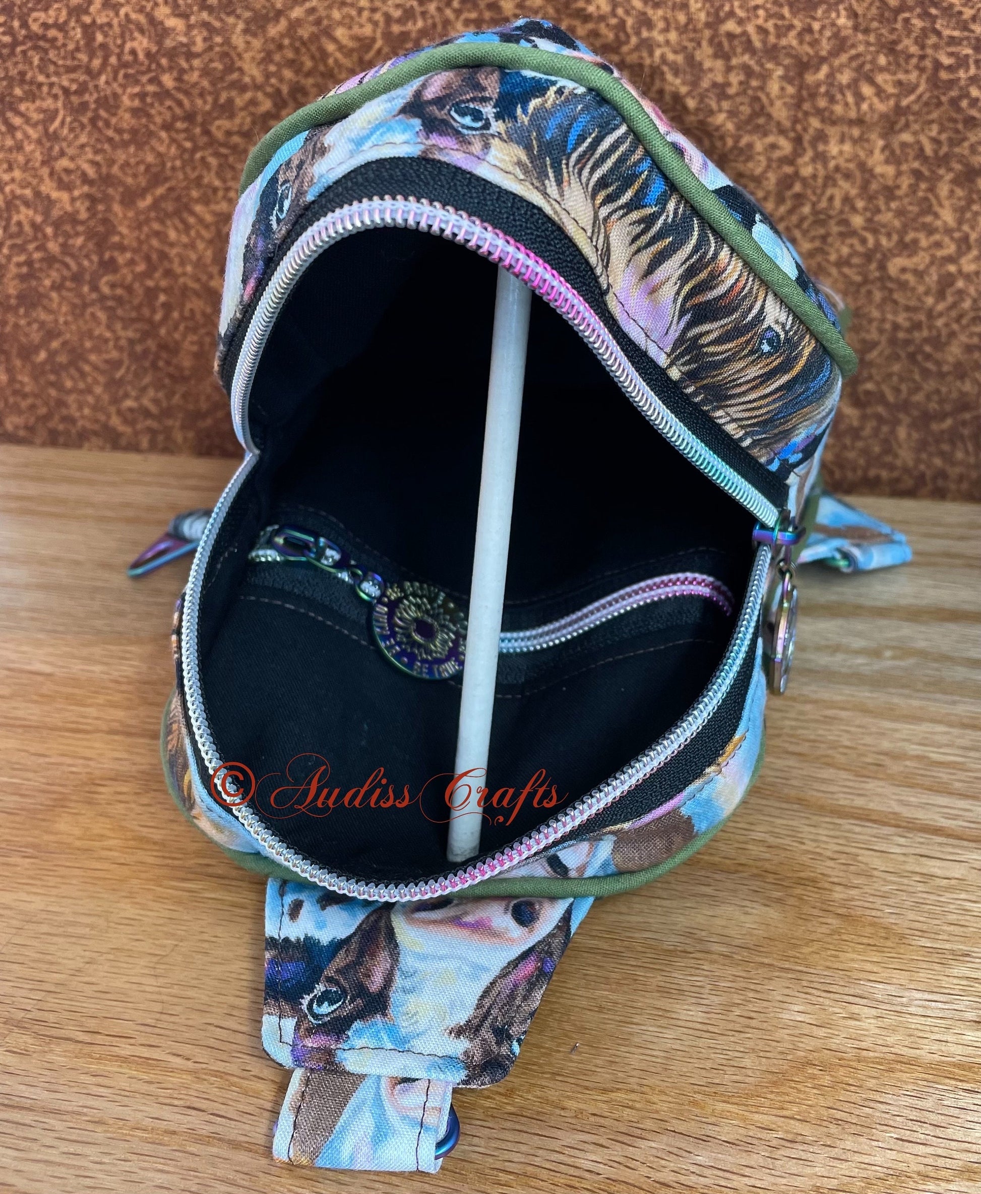 This adorable highland cow bag is designed as a front or back crossbody. The outside fabric is a cotton fabric with highland cows. The inside fabric is solid blank. This bag is made from all cotton material and lined with fusible interfacing to reinforce the material. The zipper pull on the outside zipper is a know your worth and inside is a rainbow be you pull. There are two bottom rings so that you can decide if you want a right or left leaning carry. The strap is completely removable and will be shipped inside the bag. This bag also has a slip pocket across the back where the green line of piping lies.